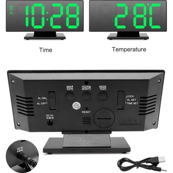 Επιτραπέζιο ρολόι καθρέφτης με οθόνη LED και ευανάγνωστους αριθμούς. Διαθέτει ένδειξη ημερολογίου (ημέρα, μήνα, χρονιά) θερμόμετρο με ένδειξη θερμοκρασίας και ξυπνητήρι. Η ένταση του φωτισμού χαμηλώνει αυτόματα από 18:00 το απόγευμα έως 07:00 το πρωί για να μη σας ενοχλεί. Λειτουργεί με καλώδιο USB.